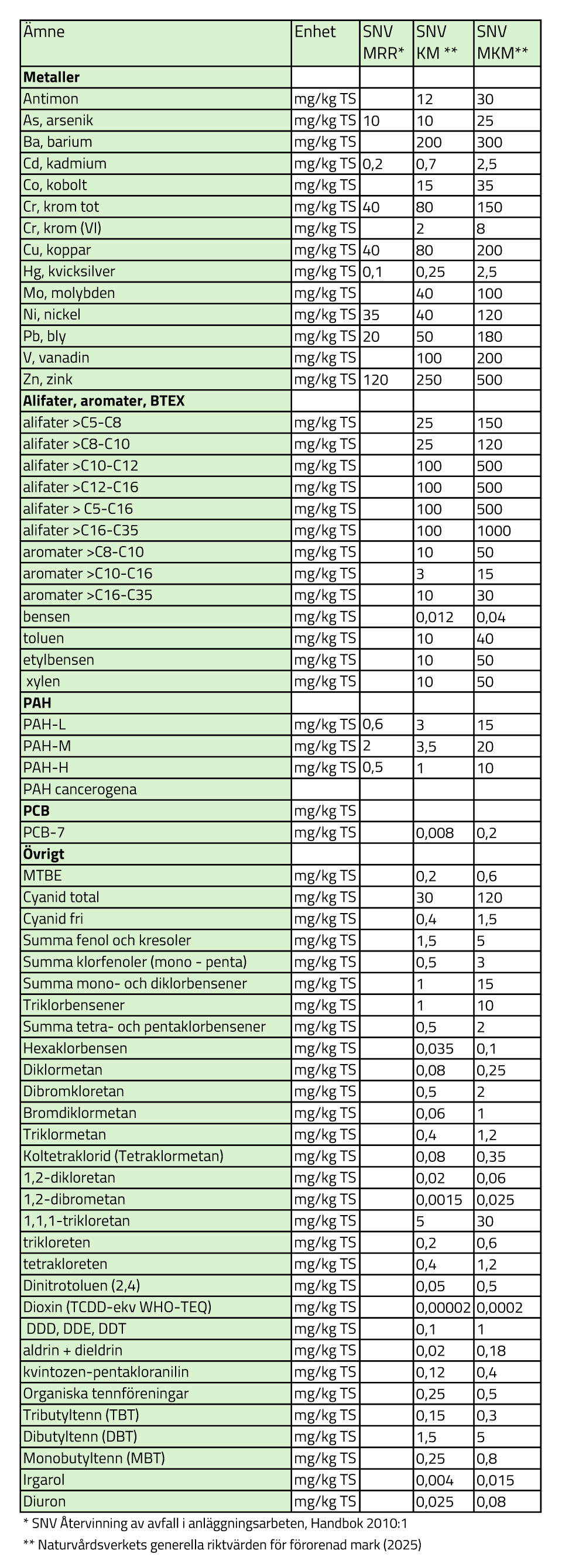 Lista med Naturvårdsverkets generella riktvärden.